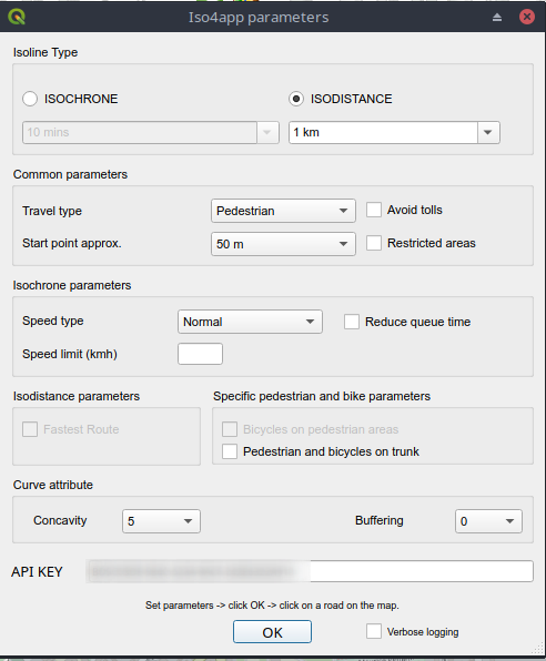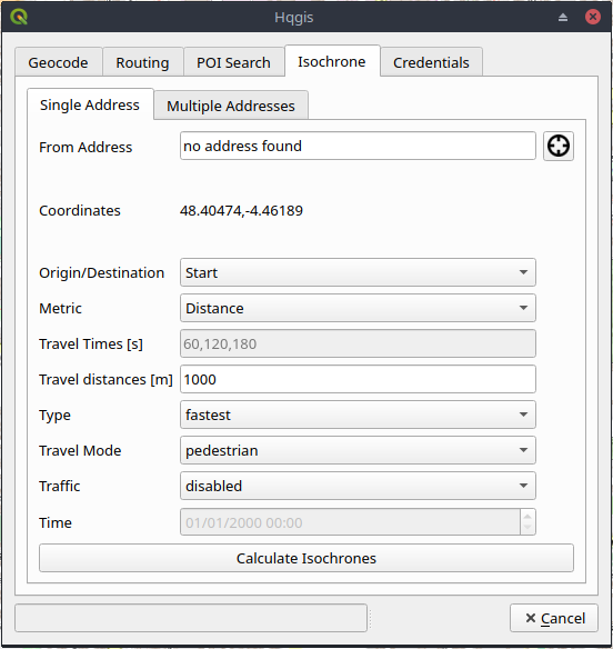 Là encore, enregistrement, clé API, mot de passe... Plus compliqué, les paramètres sont accessibles via les boîtes de traitement. En plus, comme le nom l'indique, ce plugin ne travaille qu'avec le temps, j'ai donc triché en mettant 15min à pied (ce qui correspond à env. 1 km pour moi).