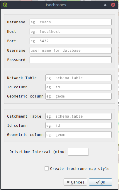 J'ai déjà eu l'occasion de l'utiliser mais depuis, je n'ai pas reparamétré ma base POSTGRESQL pour cela. Donc, je vous en parle vite fait car il nécessite d'avoir une base postgis installée et d'avoir des tables avec des paramètres précis (Network table qui est la table du réseau peut très s'obtenir depuis les tracés OSM). Et comme j'ai la flemme de tout paramétrer, je ne vous montre que la fenêtre.