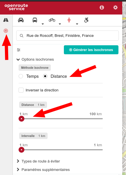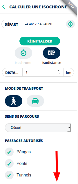 Geoportail offre la possibilité de tracer de tracer des isochrones. Pour cela, il suffit d'aller dans les outils à droite, puis sur isochrone et là on peut choisir isodistance, puis 1 km. (j'ai mis une flèche qui descend parce-que j'ai loupé le bouton de "calculer"