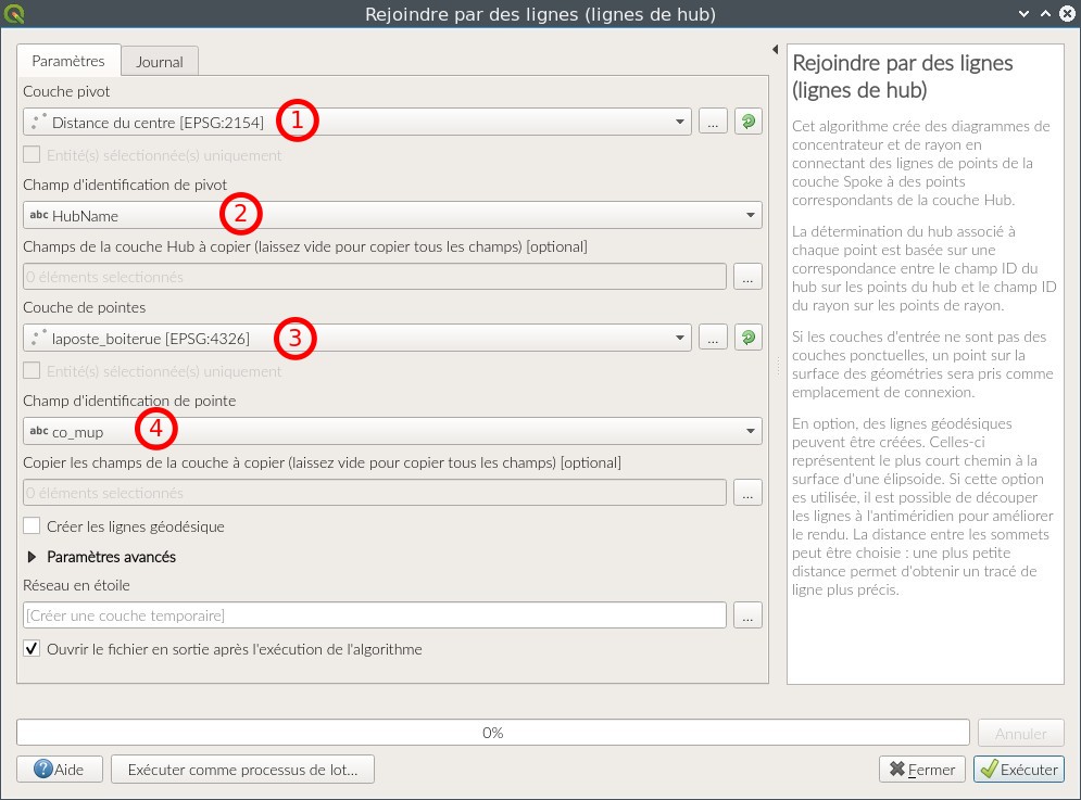 - la couche "distance aux points" créée dans l'étape précédente, qui sera le point de départ de nos lignes,