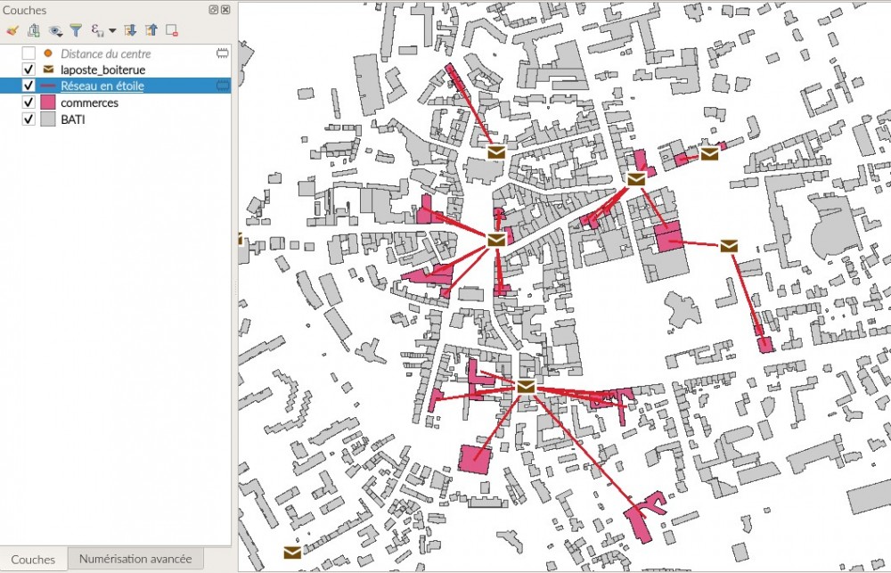 Ce qui crée une couche de lignes, (si tout va bien) allant du centroïde des surfaces (commerces) vers les points (boite aux lettres)