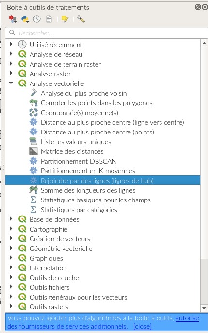 Encore dans la boîte à outils,aller dans 'analyse vectorielle' (ou recherche rejoindre, lignes ou autre), nous allons utiliser "rejoindre par des lignes (lignes de hub)"