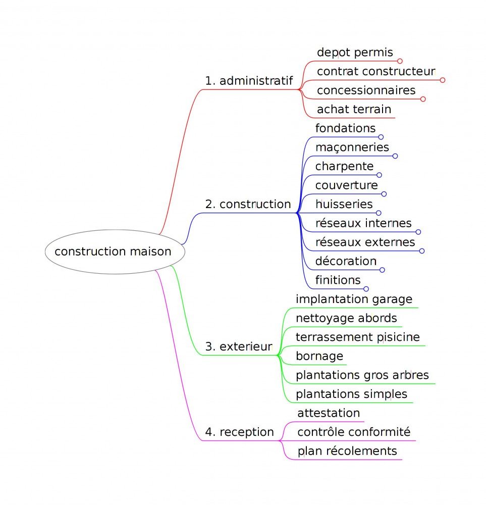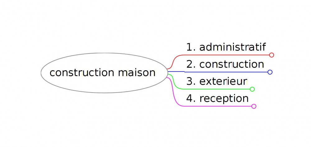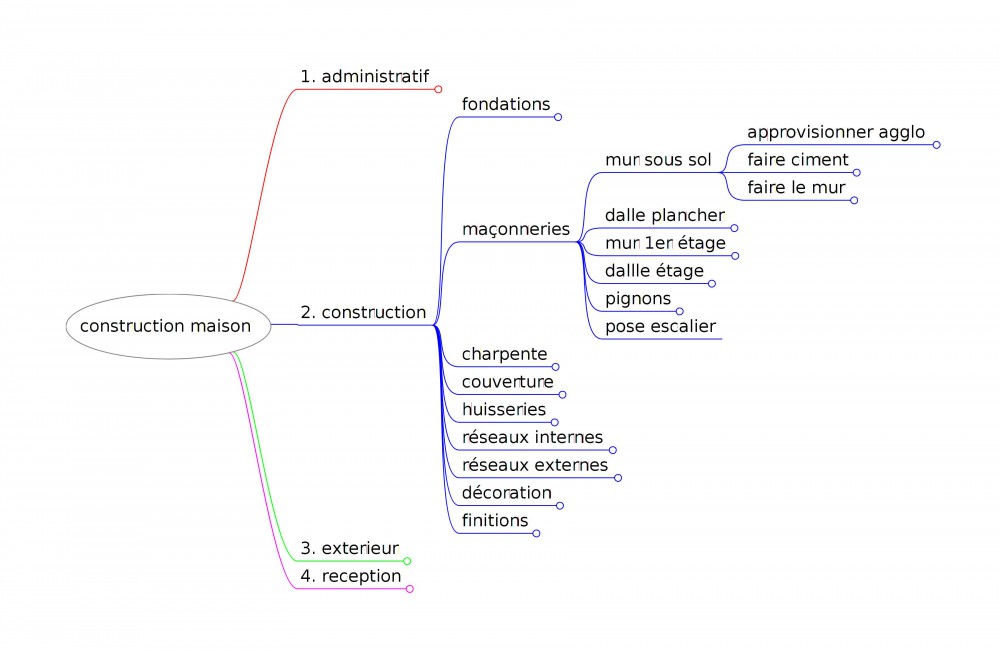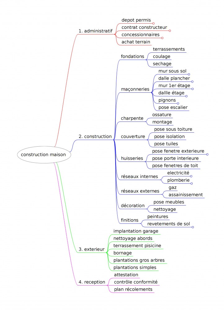 Comme pour les cartes (ou les plannings) , tout dépend du zoom dont vous avez besoin. Si vous êtes l'opérateur ou le directeur général, vous n'avez pas besoin du même degré de précision. Partons d'un exemple, commun à tous et que l'on retrouve régulièrement en démo dans les sites (à force de voir toujours les mêmes exemples, on finirait par penser que cela ne s'applique qu'à ce cas... mais bon, je digresse) : construction de maison. Quand je dis commun à tous, je ne parle pas de moi, car je n'ai pas construit, je ne suis donc inspiré de planning tout fait sur le web pour créer des tâches.