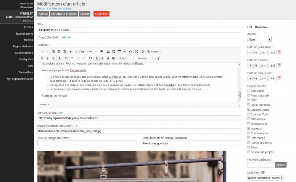 À propos des images : les liens ne sont pas morts (ouff…) et pointe vers le dossier upload de wordpress, je peux donc les conserver tel que en gardant le répertoire pour les anciens articles. Pour les nouveaux, tout sera bien rangé dans les médias de Pluxml.