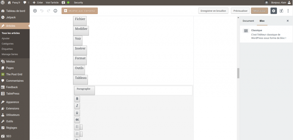 Voici 3 ans que j'utilises Wordpress, d'abord dans sa forme de base, puis avec des plugins de rédaction type note de bas de pages, tableau…puis des mises en page avec Elementor. Et du coup, je courrais sans arrêt après la performance d'affichage, j'ai donc installé des plugin de cache, d'optimisation d'images…plus des messages bizarres