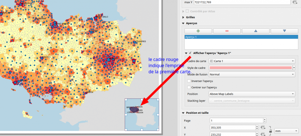 Ce pavé est l'élément central est doit occuper la plus grande partie de votre présentation. Avec QGIS, on peut placer 1 ou plusieurs cartes* sur une page avec :