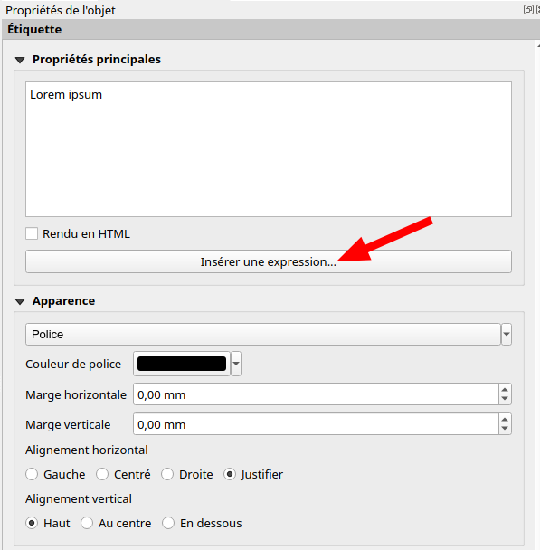 Même principe, je clique sur ajouter, puis clic-glisser pour dessiner le cadre. Un clic simple vous propose une fenêtre de dimension. Ici, ce qui intéressant, ce sont les propriétés : il est possible de taper le texte mais surtout d'insérer des expressions.