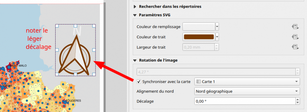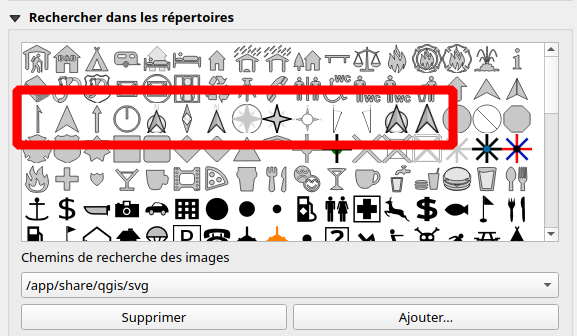 La partie sous la flèche bleue vous emmène directement dans le répertoire des symboles SVG de QGIS. Les paramètres SVG permettent de régler la couleur de ces symboles. Vous noterez donc que vous avez accès aux "flèches nord" par exemple.