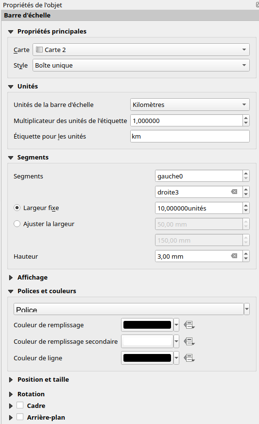 Sinon on peut utiliser ajuster la largeur : ici la variable d'ajustement va être la longueur du segment avec comme conditions fixe la largeur minimale et maximale du cadre. Par défaut, le valeurs sont entre 50 et 150 mm, c'est à dire que votre cadre ne fera jamais moins de 50mm et jamais plus de 150mm. Ce qui permet de faire varier les échelles en fonction des cartes sans modifier manuellement la taille des segments, mais ce qui fait que c'est l'ordi qui décide de la taille des segments. astuce : la boite st'étend vers la droite, donc ne pas la coller à droite de la page !