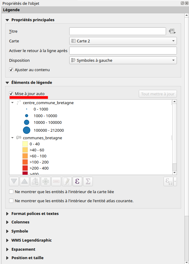 En décochant la case Mise à jour auto, vous prenez le contrôle des éléments de légende. Et à partir de là, vous pouvez :