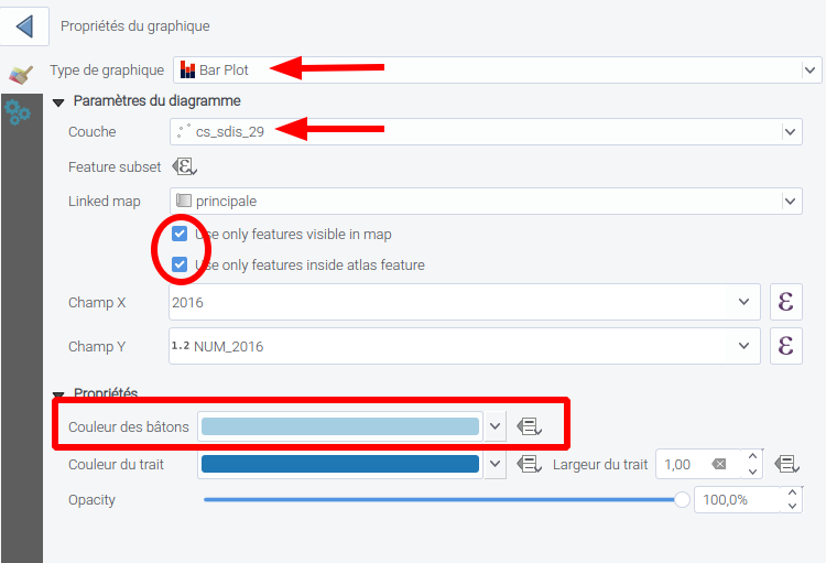 Dans les propriétés du graphique (en cliquant sur setup selected plot), je choisis bar plot (pour les graphiques en barre), je choisis la bonne couche. On oublie pas de sélectionner que les entités présent dans la carte. Les paramètres x (taper 2016) et y : le champ qui contient la donnée.