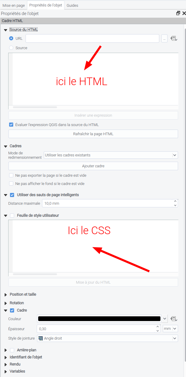 Une fois les bons réglages trouvés, sélectionner le code HTML (boîte du milieu du site), copier, et coller dans la partie Source des propriétés du cadre. Ensuite, idem pour le code CSS