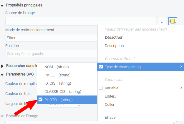 Pour la partie photo, rien d'extraordinaire, je mets la photo du centre donnée dans les attributs de la table via les champs disponibles (ici "photo")