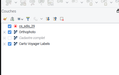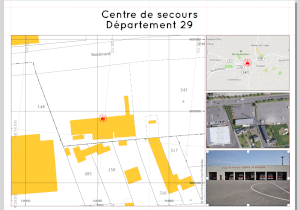 Donc je pars sur un fond CARTO VOYAGER LABELS MAPBOX STREETS V10 (j'ai changer à la fin de l'article pour avoir plus de détails dans la carte de situation), les centre de secours du SDIS, et grâce à leur super plugin : les photoaériennes et le cadastre de Géobretagne.