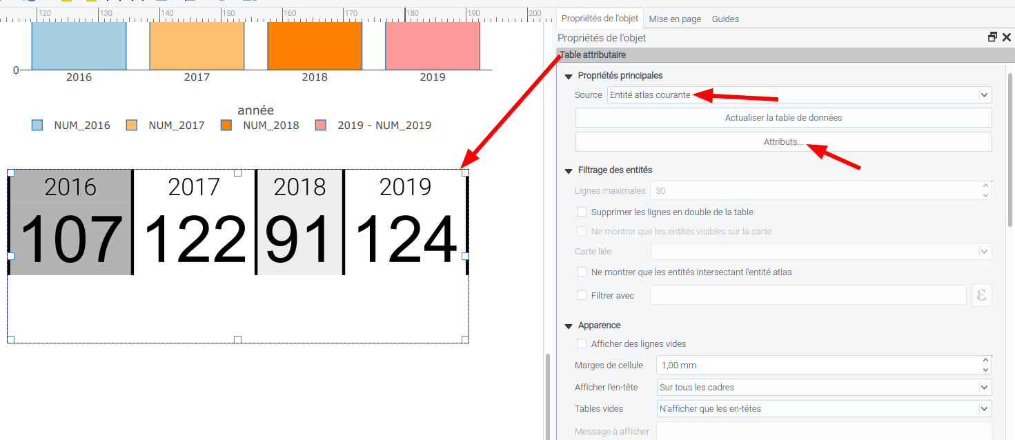 Allez juste pour vous montrer que l'élément qui ajoute la tables d'attributs est également très maniable. Je choisis 'entité atlas courante' pour avoir une table dynamique en fonction de l'atlas. Je crée un rappel des données du graphique en sélectionnant les mêmes champs.