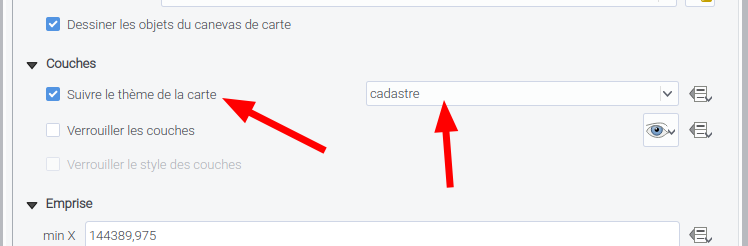 Pour cela, sur chaque carte, je vais utiliser, dans les propriétés de ma carte, la partie "couches". Je coche"suivre le thème de la carte" et dans le menu déroulant le thème qui va bien.