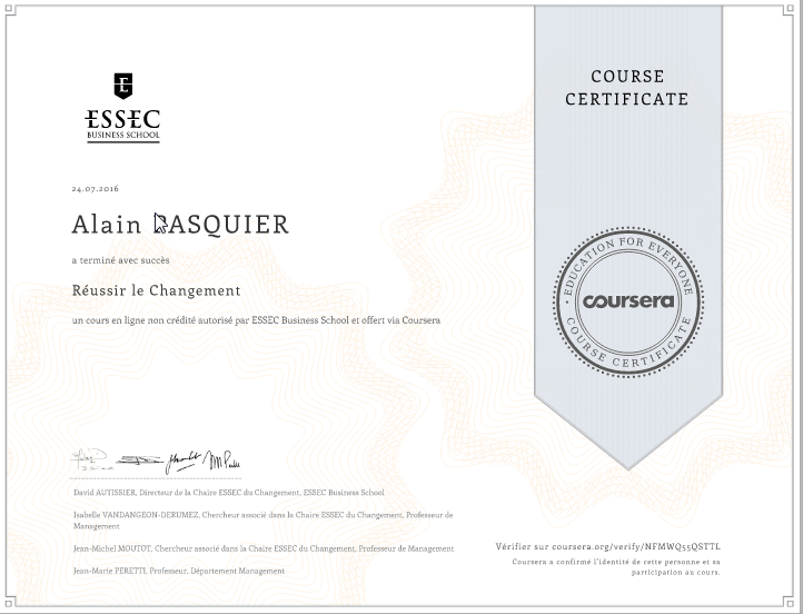 Et paf, je viens d'avoir mon papier de réussite du dernier MOOC que j'ai suivi : "Réussir le Changement par Ecole de commerce ESSEC sur Coursera. Certificat obtenu le 24 juillet 2016" avec les détails cela donne :