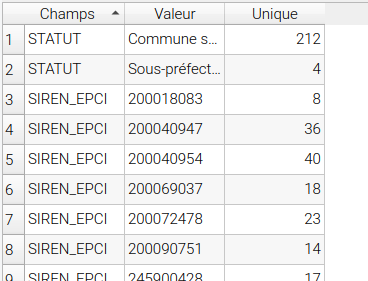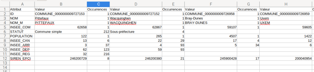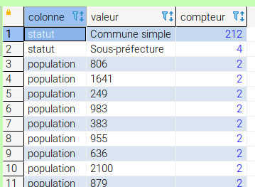 - si je regarde la ligne STATUT, j'ai 212 "commune simple"; 4 "Sous-préfecture" et, comme il n'y a plus de valeurs dans les autres colonnes de la ligne, il n'y a pas d'autre occurrence.