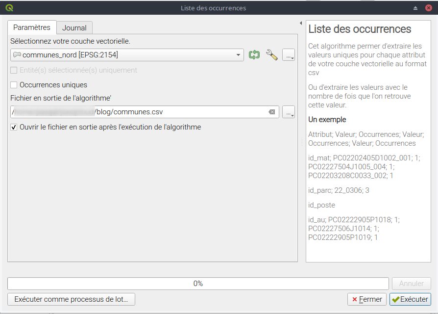 Ensuite, lancer le script, une couche virtuelle est créée. Dans mon exemple, en ouvrant la table attributaire de count_communes_nord, je peux lire le résultat