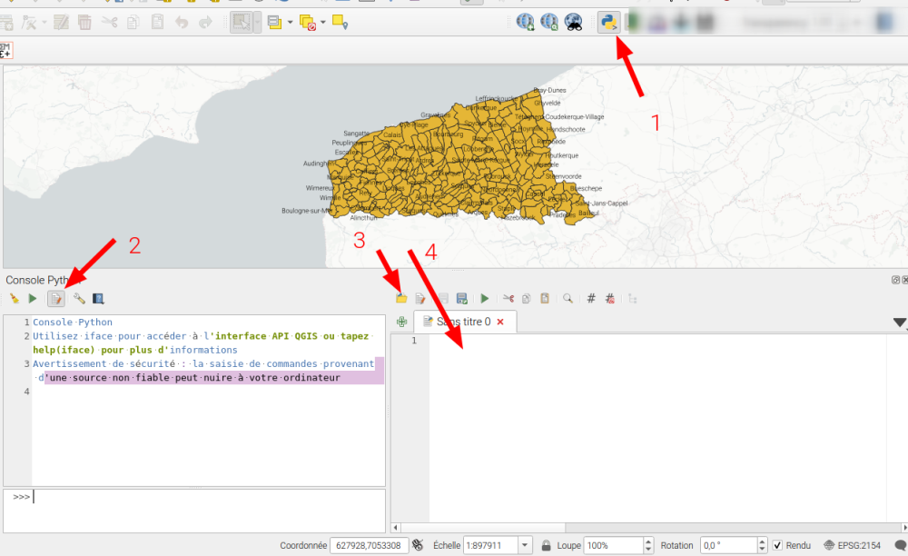 Regardons pour automatiser la liste et le comptage avec un script python. Alors rappel, pour utiliser un script, on ouvre la console (1), puis ouvrir l'éditeur (2), et soit nous ouvrons un fichier(3), soit nous saisissons dans l'éditeur (4) et là un copier-coller avec le code peut fonctionner. N'oubliez pas d'enregistrer votre script.