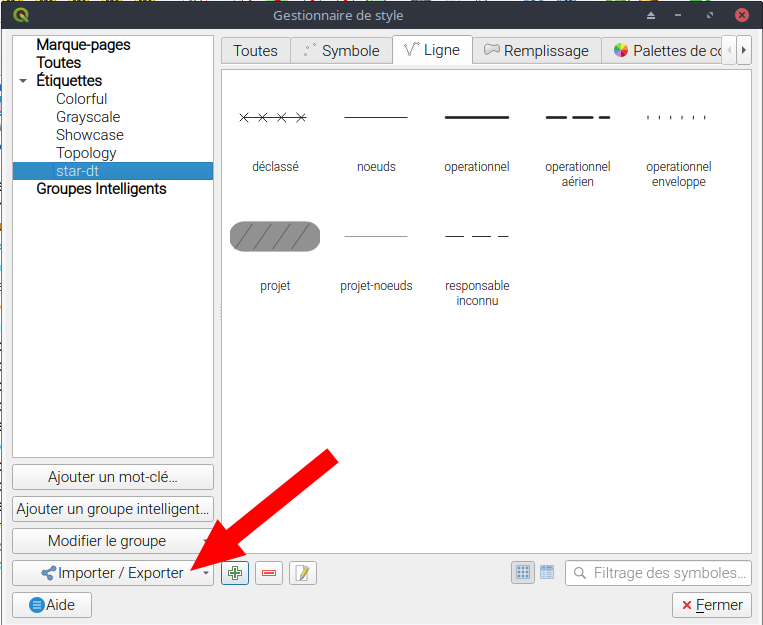 J'ai dessiné vite fait les symboles sous inkscape (dans le dossier symboles), qui devront sûrement évoluer avec le travail d'autres groupes de travail, et je pense dans le sens de la simplification (un carré à la place du dessin batimenttechnique par exemple). Les lignes peuvent être importées dans le gestionnaire de style :