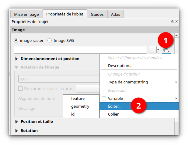 Vous posez un objet image dans votre mise en page, puis dans les propriétés d'une image RASTER, l’icône au bout du choix du chemin -> éditer :