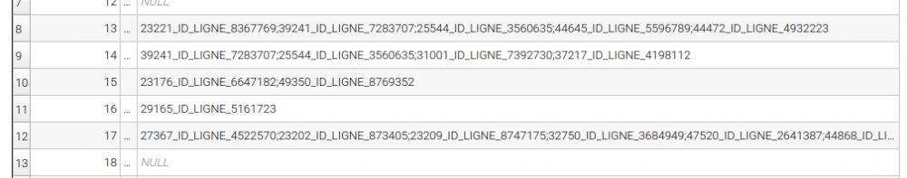 Je rappelle que ma couche de polygone est stockée en postgis, c'est pour cela que je stocke dans un array (avec les {}), mais pour un autre format (.shp...), on peut très bien stocker simplement une liste sous forme de texte. On enlève les '{'|| et ||'}' et on les sépare avec un ' ; ' par exemple.