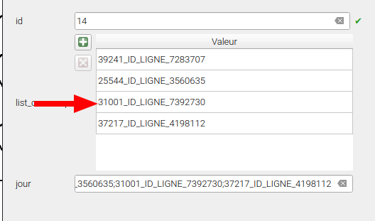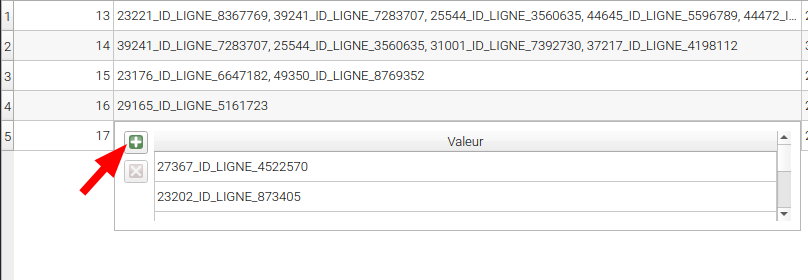 Et dans QGIS, qui reconnaît que c'est un champs contenant un tableau, on peut abonder le tableau avec l'ajout de valeur (le +), remarquez les lignes qui liste les élèments :